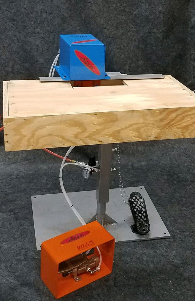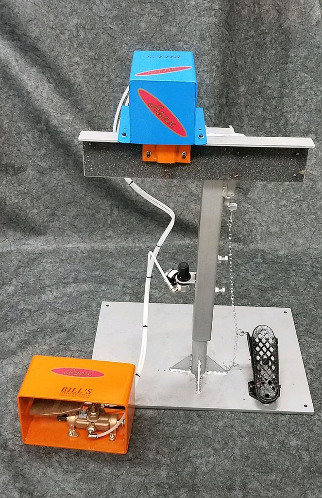 Bill's fabricates Pneumatic Upholstery Arm Clamps in-house. These clamps are designed to hold the chair arms while it is being upholstered, and their height is adjustable to best accommodate the upholsterer.